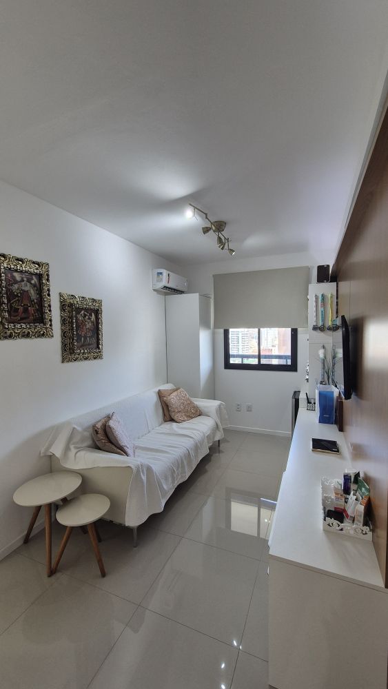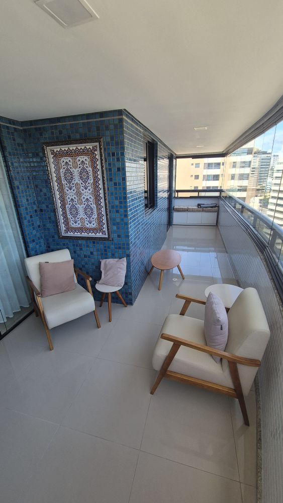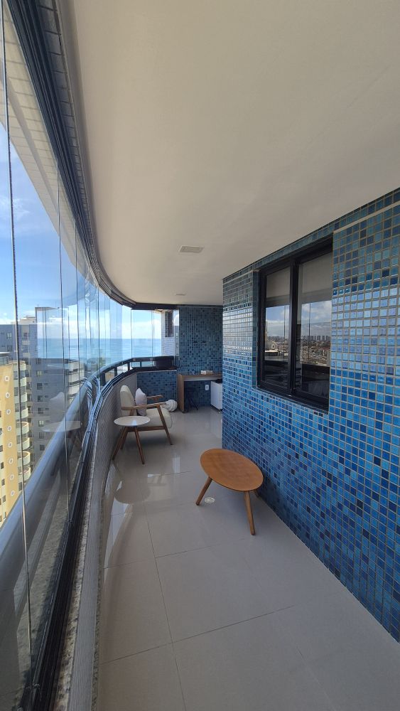 Conta com varanda extremamente ampla com fechamento em Reiki e vista mar, proporcionando ventilação e iluminação naturais o dia todo.